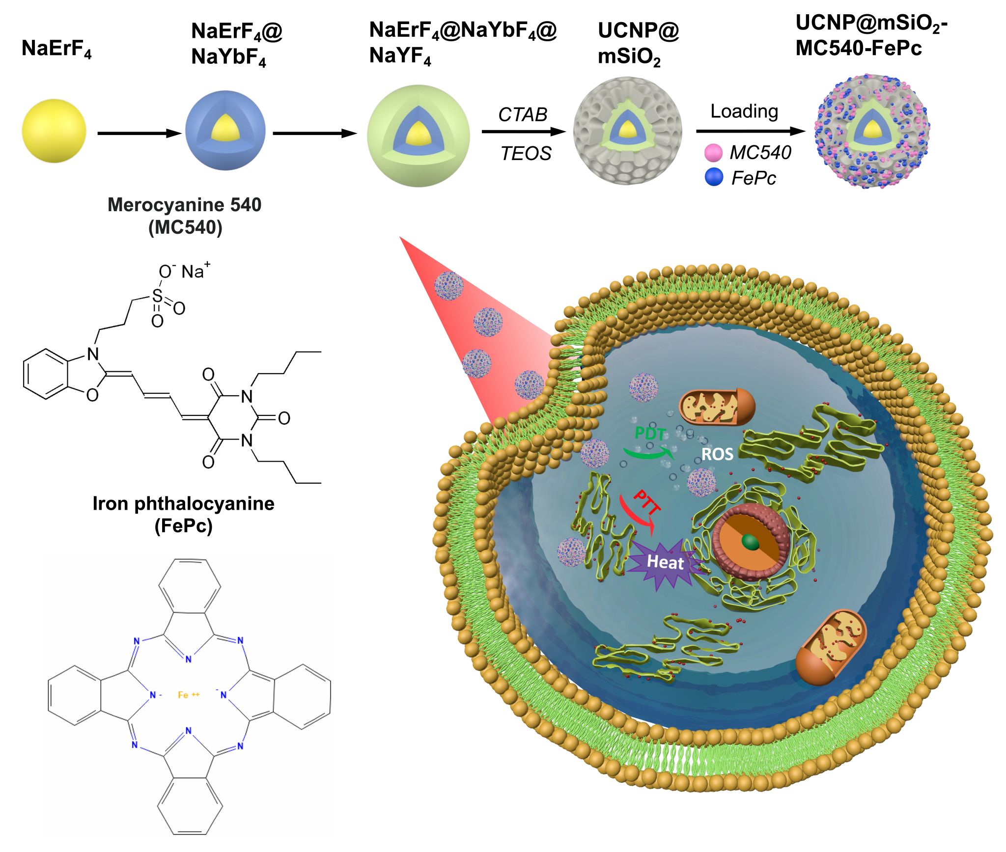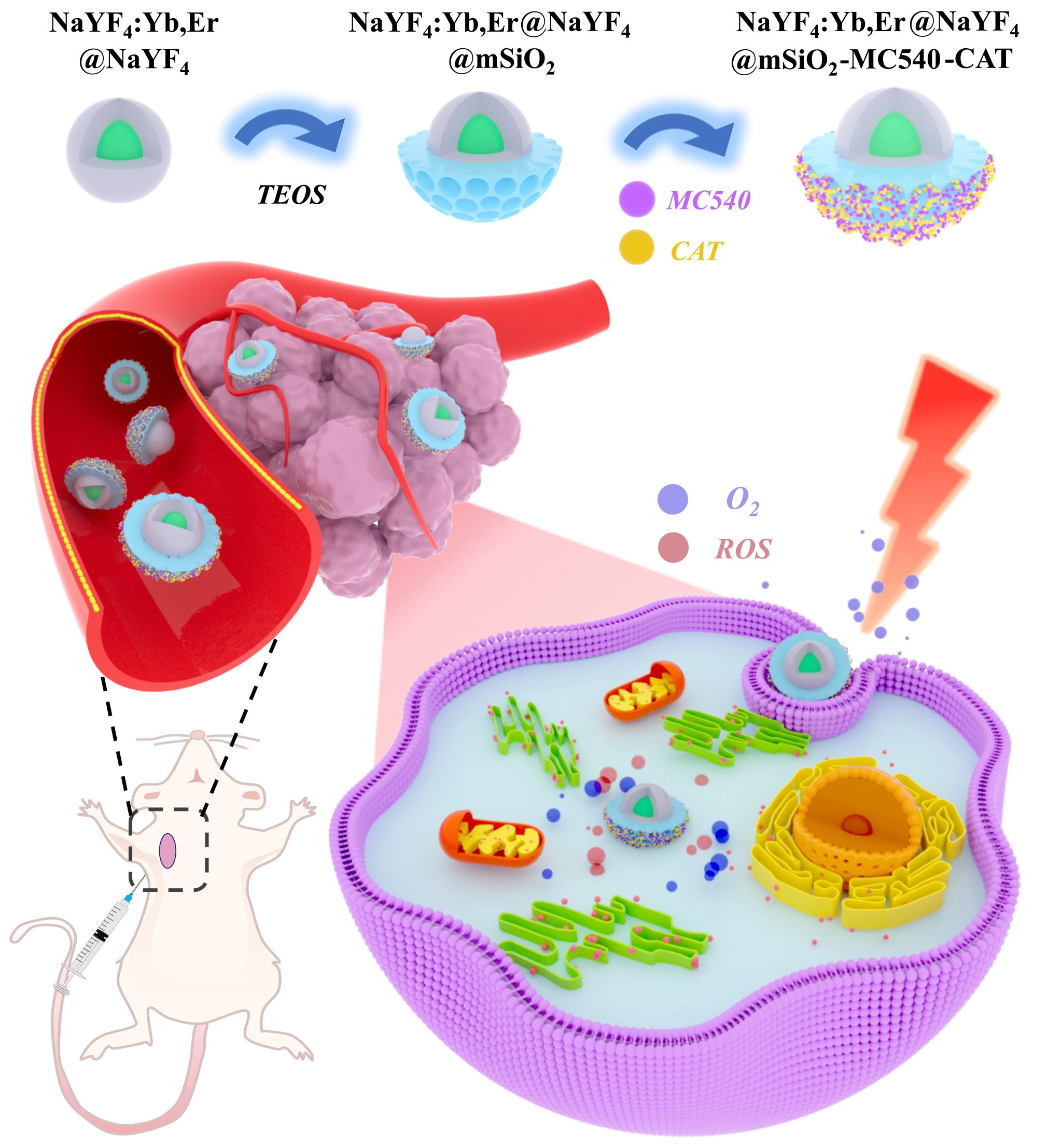尽管上转换纳米颗粒(UCNPs)能够将长波长光转换为短波发射,以缓解光学治疗中光损伤和穿透不足的问题,但传统 UCNPs 主要在近红外 I 区激发,仍面临散射和过热限制。本研究构建了可在1550 nm 近红外区激发的 NaErF4@NaYbF4@NaYF4 体系,并通过调节核–壳–壳结构,精准设计红绿光发射性能。在进一步包覆介孔二氧化硅并负载光敏剂与光热剂后,可形成光动力/光热的协同纳米治疗平台,有效提升了光疗效果。