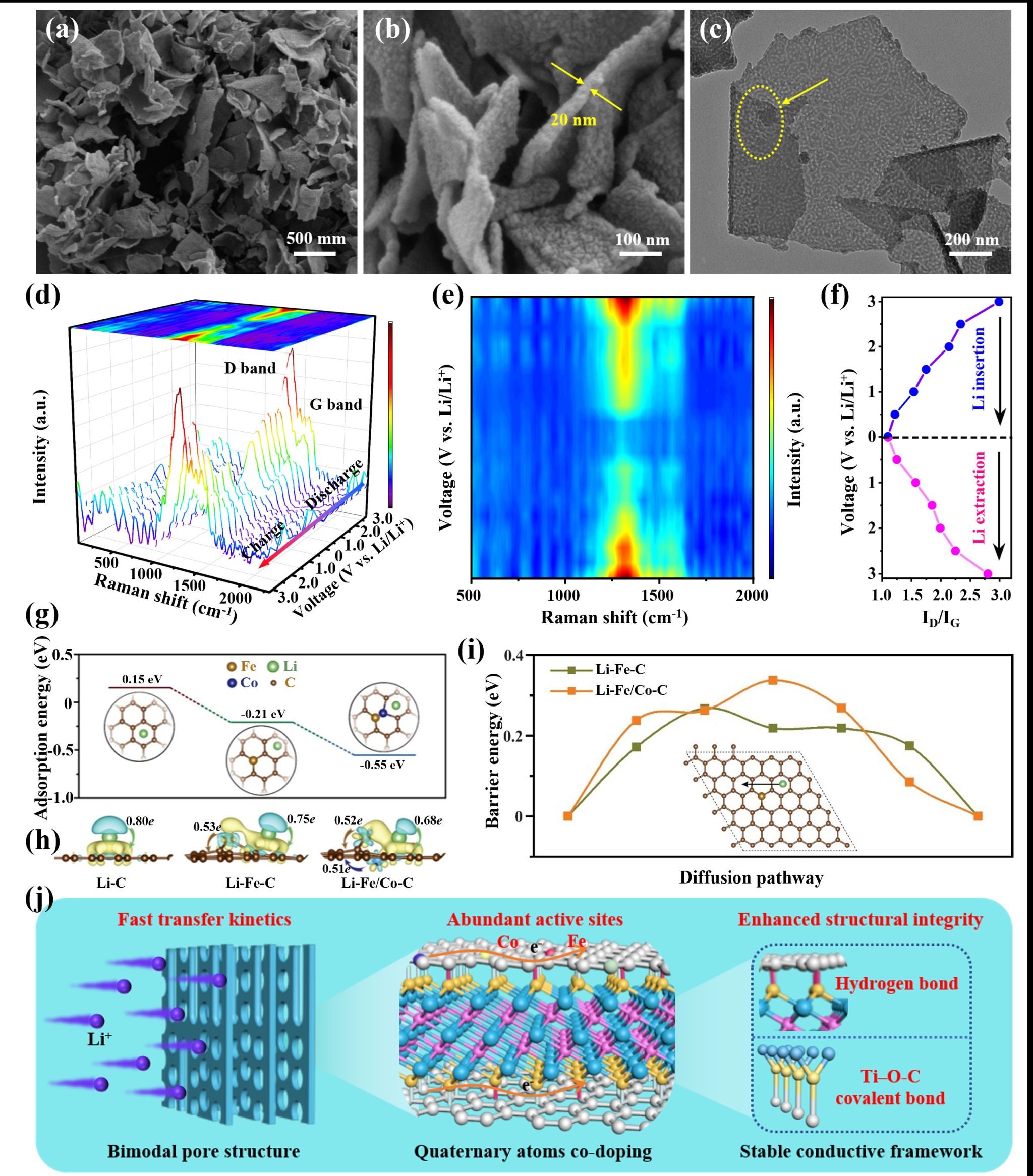 针对上述挑战,团队通过植酸介导的组装策略,将杂原子掺杂的具有双模式孔结构的介孔碳成功组装到二维Ti3C2Tx纳米片表面。研究表明,植酸在整个组装过程中扮演了多重角色:其强配位能力确保了Fe/Co单原子的精确引入;而丰富的羟基不仅增强了胶束与基底间的界面锚定,还诱导了球形与柱形孔道的形成。同步辐射分析和理论模拟证实,高度分散的Fe–N₄/Co–N₄构型与富氮碳基质协同,显著提升了锂离子的吸附能并增加了储存位点。原位/非原位表征进一步揭示了双介孔结构对锂离子传输动力学的加速作用。所制备的复合材料在0.1 A g-1 的电流密度下循环100次后表现出713.2 mA h g-1 的高锂存储容量。该研究为开发杂原子掺杂的高性能介孔碳电极材料提供了可行的策略。
