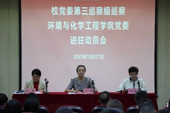 根据校党委统一部署,2025年10月27日,校党委第三巡察组巡察环境与化学工程学院党委进驻动员会召开。副校长于雪梅、校党委第三巡察组组长吴蔚、副组长丁珏及巡察组全体成员、巡察办有关同志,以及学院党政领导班子成员、党委委员、各党支部书记、系所中心负责人、学科带头人、校党代会及教代会代表、工青妇组织负责人、民主党派代表、教师代表、学生代表及退休人员代表等100余人参加会议。会议由环化学院党委书记钱冬英主持。