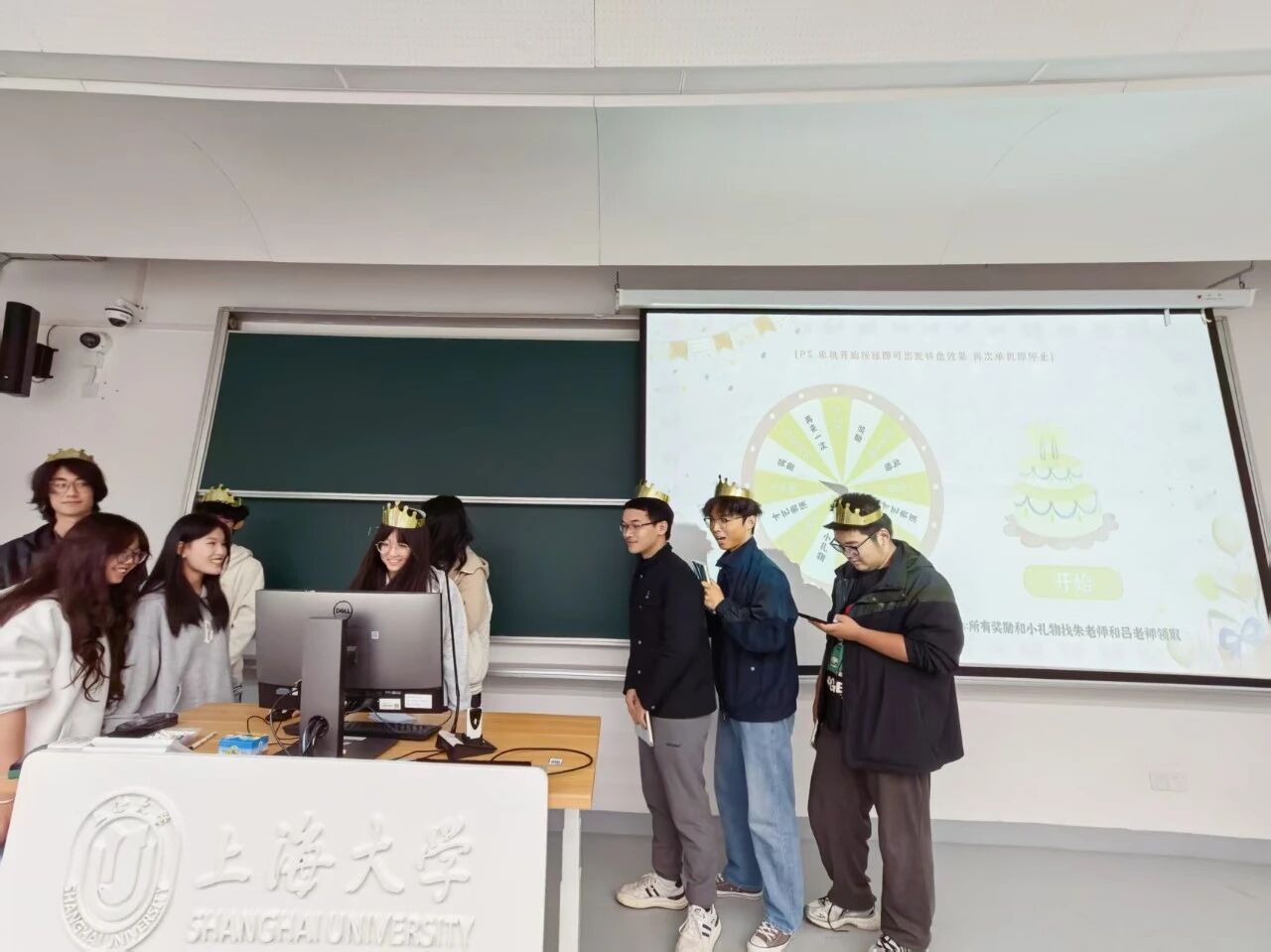 2025级理学工学II类五班的生日会由班长王馨主持。活动伊始,班导师吕丽萍老师与李卓师老师为班级内9-12月生日的同学送上定制专属笔记本,并为生日同学戴上生日帽,象征着集体对每一位学子的重视与祝福。恰逢两位班导师当天与次日生日,同学们也为老师们送上最诚挚祝福。全体同学齐唱生日歌后,老师们共同执刀切开蛋糕,分享甜蜜的同时,也拉近了彼此间的距离。在轻松的氛围里,团支书张一笑组织开展趣味转盘游戏,转盘上的“才艺展示”“幸运抽奖”等环节引发阵阵欢笑,现场气氛持续升温。