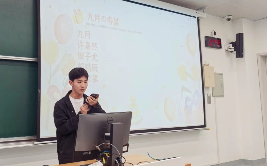 2025级环境工程一班与二班的联合生日会由一班团支书刘宇赫主持,班导师叶蓓老师、游学极老师共同出席。游老师与叶老师首先共同为两班9-12月生日的同学发放专属笔记本。在生日帽的点缀下,全体同学在合唱中表示对生日同学的祝福。活动设计了“感恩祝福”环节,刘宇赫代表同学们向即将在12月生日的叶老师送上鲜花,表达对老师一直以来的关心与指导的感谢。最后,刘润畅同学上台以一首温暖的歌曲为在场所有生日同学及叶老师送上专属祝福,悠扬的歌声将现场温馨氛围推向高潮,赢得了师生们的热烈掌声。