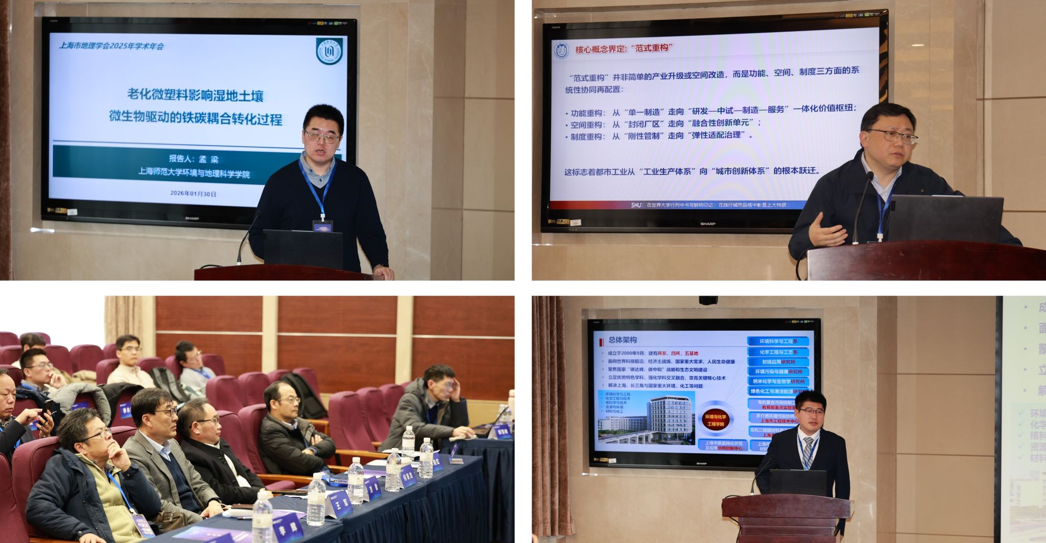 下午,上海大学城市更新研究院副院长王剑副研究员、上海师范大学孟梁教授分别作题为《新质生产力驱动下都市工业的空间重构》、《微塑料影响湿地土壤微生物驱动的铁碳耦合转化过程研究》的报告,围绕都市工业空间演化与环境过程机理等前沿议题分享了最新研究进展。上海大学环境与化学工程学院副院长王道源副教授主持报告环节,并汇报了上海大学环境与化学工程学院在学科建设和人才培养等方面的建设成效。