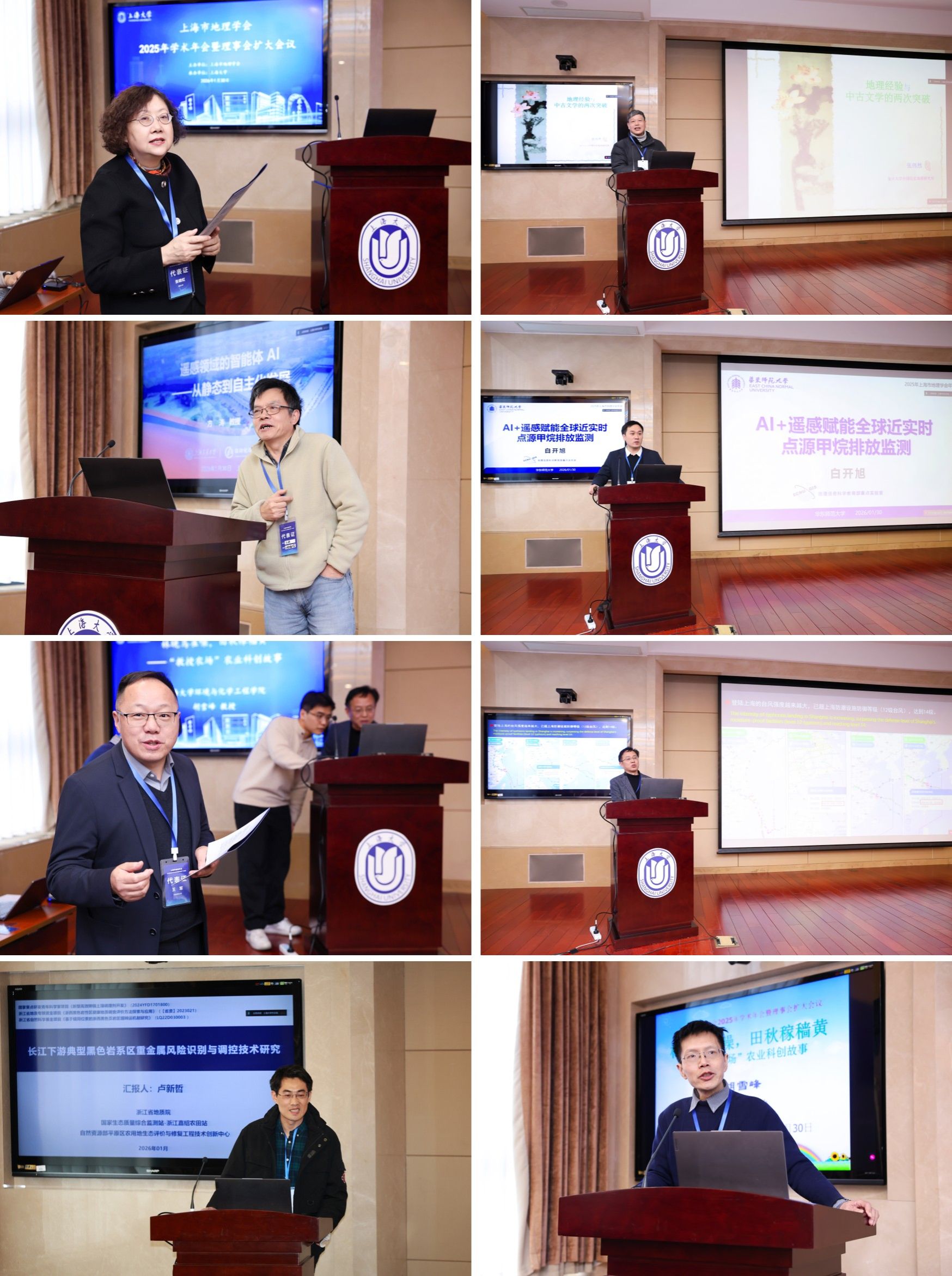 复旦大学张伟然教授、上海交通大学方涛教授、华东师范大学白开旭教授、浙江省地质院卢新哲高级工程师、上海市水利工程设计研究院有限公司季永兴副总经理、上海大学胡雪峰教授分别作题为《地理经验与中古文学的两次突破》、《遥感领域的智能体AI——从静态到自主化发展》、《AI+遥感赋能全球近实时点源甲烷排放监测》、《长江下游典型黑色岩系区重金属风险》、《连续台风登陆后对上海防潮安全的思考》、《林晚鸟雀噪,田秋稼穑黄——“教授农场”农业科创故事》的学术报告。报告围绕历史地理、智能遥感、甲烷排放监测、地质环境风险、防灾减灾、农业科技创新与服务等领域,既有学科前沿的研究进展,又有科创产业的实践思考,内容丰富,精彩纷呈。