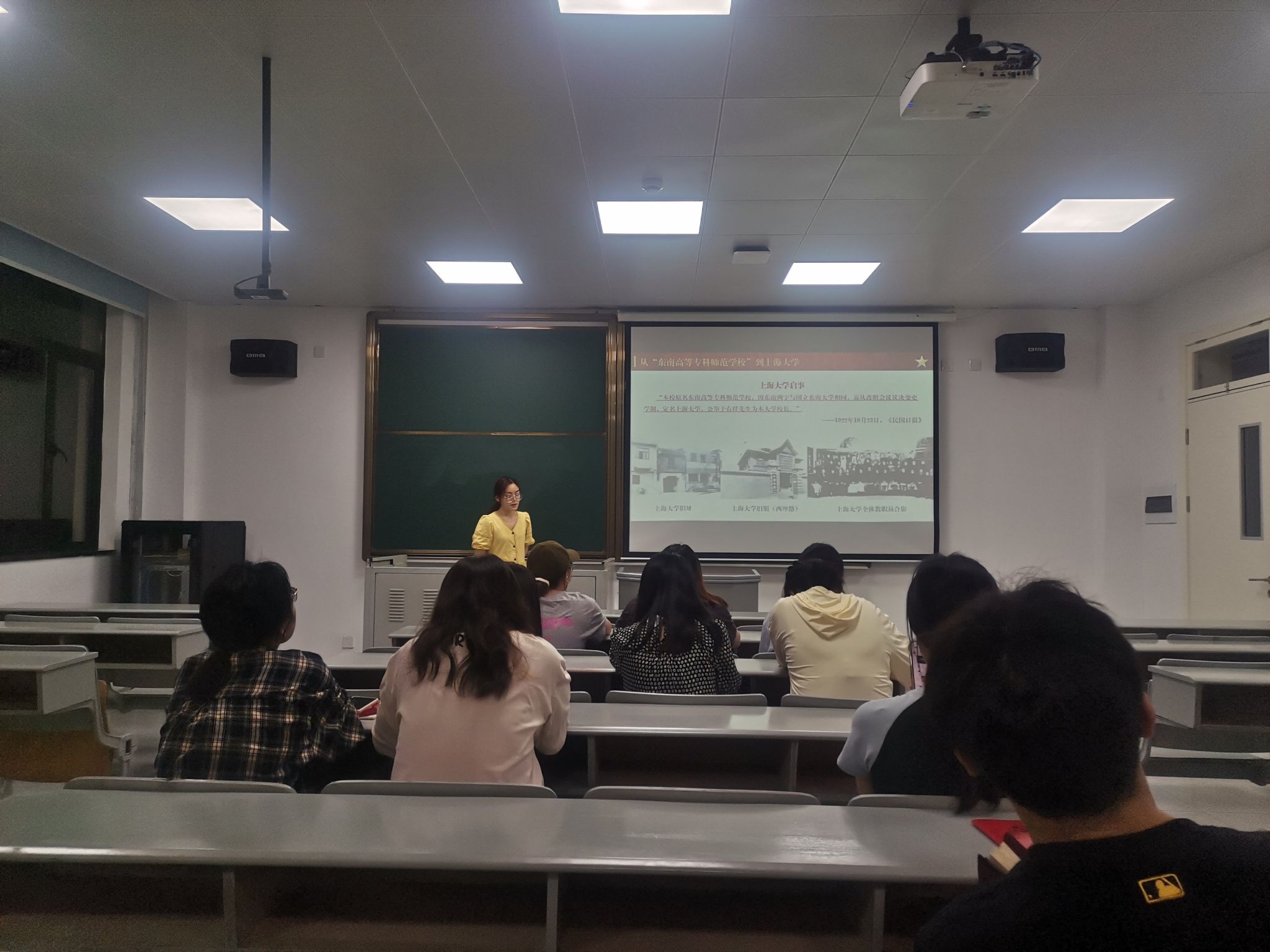 2023级研究生化工一班党支部书记张笑冉从《南京路上的五卅惨案》油画引入,向同学们介绍了上海大学在党的创建、发展历程中所扮演的关键角色,并号召研究生党员应以新质生产力推动科技创新,为国家的繁荣与发展贡献力量。