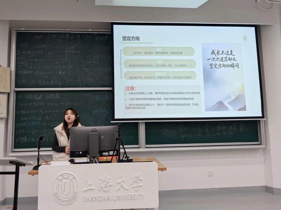 保研至同济大学的张乐佳棋同学首先回顾了个人大学历程。从高考失利的迷茫到坚定保研目标,她用“你的光芒,一张试卷定义不了”激励新生直面挫折。她分享了保研、考研、就业三条路径的筹备要点,支招全英文课程学习经验,并提醒新生提前关注志愿时长、四级、泳测等必备要求。谈及科研竞赛,她讲述了从主动咨询导师加入课题组,到组建跨学科团队备战“挑战杯”的艰辛与收获,鼓励新生“机会永远掌握在自己手里”。