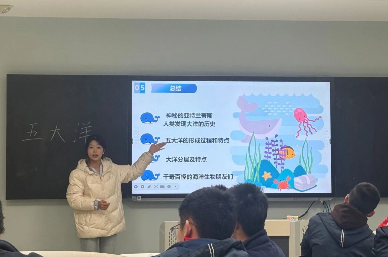 初中的课堂上开展了一场以“浩瀚的海洋五大洋”为主题的生态科普课程。课程围绕“认知海洋—探索海洋—保护海洋”的逻辑主线展开,从五大洋的地理特征与演化历程入手,逐步深入到海洋生物多样性及分层生态系统的介绍,最后引导学生关注海洋污染现状与保护行动,形成从知识积累到责任意识培养的完整教学闭环。