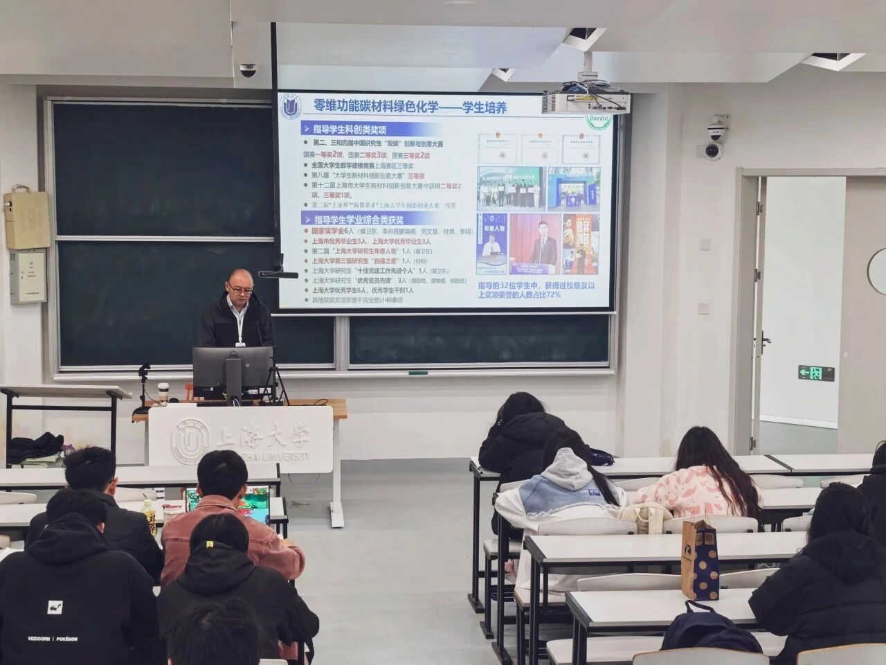 活动伊始,王老师以2023年诺贝尔化学奖“量子点的发现与合成”这一热点为引,用通俗化语言解读量子点材料的核心原理,结合绿色化学与功能材料特色研究方向,展示了团队在石墨烯量子点、碳基荧光量子点等领域的最新成果。当讲到“人工智能辅助材料研发”的突破时,他分享了团队研究案例,让新生直观感受“化学+AI”交叉创新的魅力。