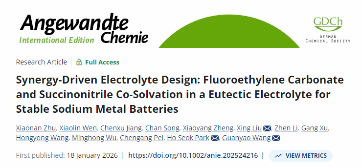 近日,我院射线应用研究所王官耀、刘星副研究员合作在化学领域国际知名期刊《Angewandte Chemie International Edition》上发表题为“Synergy-Driven Electrolyte Design: Fluoroethylene Carbonate and Succinonitrile Co-solvation in a Eutectic Electrolyte for Stable Sodium Metal Batteries”的研究论文。