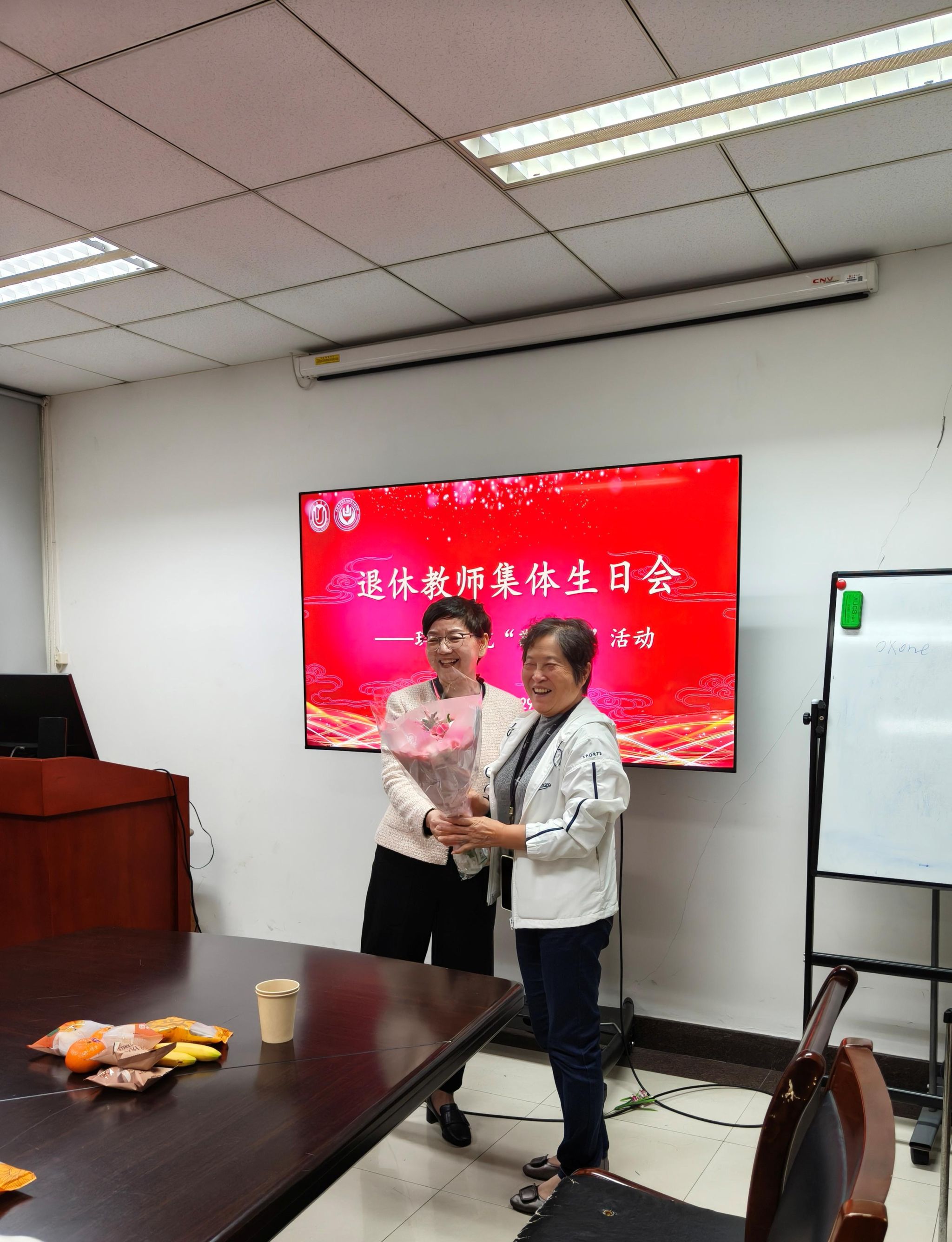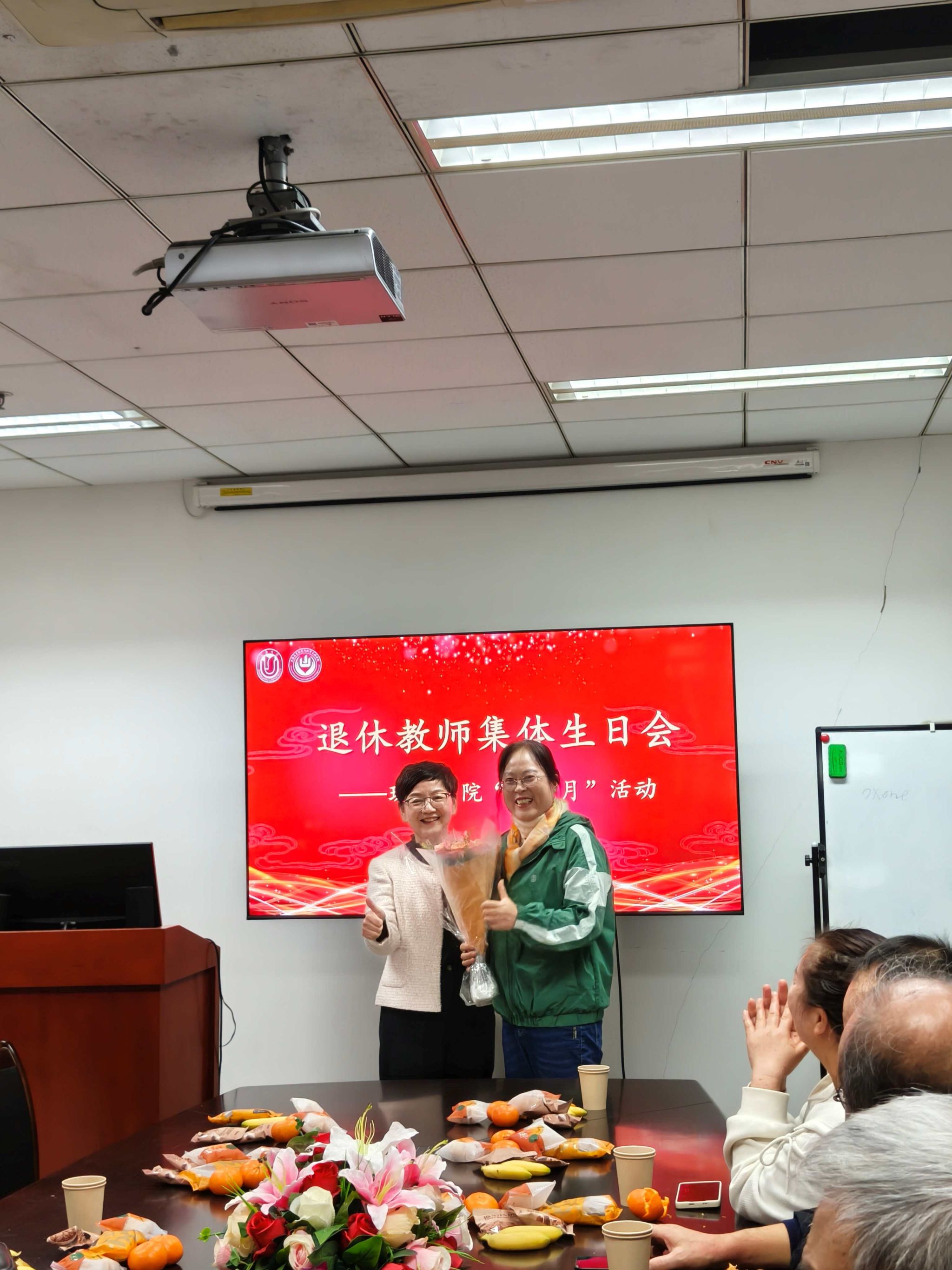 在退休教师“逢五逢十”生日会环节,学院党委书记钱冬英,党委副书记孙延枫为退休老师送上生日鲜花和祝福,全体与会教师共同唱起《生日快乐》歌。